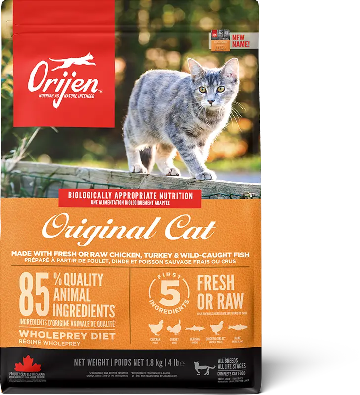 Ayude a su gato a prosperar con el poder de las recetas ricas en proteínas que proporcionan la máxima nutrición. Como carnívoros estrictos que son, los gatos necesitan una dieta biológicamente apropi,ada rica en proteínas y grasas procedentes de una variedad de ingredientes animales. La dieta Orijen Original Cat está elaborada con pollo y pavo frescos o crudos de corral y con pescado salvaje. Rep,eta de ingredientes animales de presa entera, como aves de corral, pescado, órganos y huesos, la dieta Orijen Original Cat está elaborada con las partes más nutritivas y suculentas de las presas para,”proporcionar la nutrición que los gatos necesitan. Con un 85% de ingredientes animales de calidad y un recubrimiento de hígado liofilizado, esta dieta no tiene comparación.”,”Pollo fresco (20%), pavo crudo (10%), arenque entero crudo (9%), menudillos de pollo frescos (hígado, corazón) (6%), merluza entera y cruda (5%), hígado de pavo crudo (5%), huevos frescos (5%), poll”,erdes enteras, garbanzos enteros, fibra de lenteja, alubias pintas enteras, almidón de guisantes, alubias blancas enteras, aceite de abadejo (1%), algas marinas secas, calabaza fresca entera, calabaz,”s de remolacha frescas, hojas de nabo frescas, arándanos rojos enteros, arándanos azules enteros, bayas de Saskatoon enteras, cúrcuma, cardo lechoso, raíz de bardana, lavanda, raíz de malvavisco, es”,”aramujos.ADITIVOS (por kg) Aditivos tecnológicos: extracto de tocoferol de aceites vegetales: 121mg, ácido cítrico: 40mg. Aditivos organolépticos: extracto de romero: 80mg. Aditivos nutricionales: “,”a890 cloruro de colina (colina): 1190 mg, 3b606 (Zinc: 105 mg), 3b406 (Cobre: 11 mg), 3a821 Vitamina B1: 12,5 mg, 3a825i Vitamina B2: 10 mg, 3a314 Vitamina B3: 50 mg, 3a841 Vitamina B5: 8 mg, 3a831 “,”itamina B6: 6,5 mg, 3a316 Vitamina B9: 0,75 mg, 3a880 Vitamina B7: 0,13 mg, Vitamina B12: 0,1 mg, 3a710 Vitamina K3: 0,5 mg, 3a672a Vitamina A: 3750 UI, 3a671 Vitamina D3: 500 UI, 3a700 Vitamina E: “,”90 UI, 3a300 Vitamina C: 12,5 UI. Aditivos zootécnicos: 4b1707 Enterococcus faecuim NCIMB 10415 2,2×10^6 UFC.”,”Proteína 40 %Contenido de grasa 20 %Materia inorgánica 8 %Fibra bruta 3 %Humedad 10 % Calcio 1,4 % “,4160 kcal/kg (541 kcal por vaso 250ml/130g,