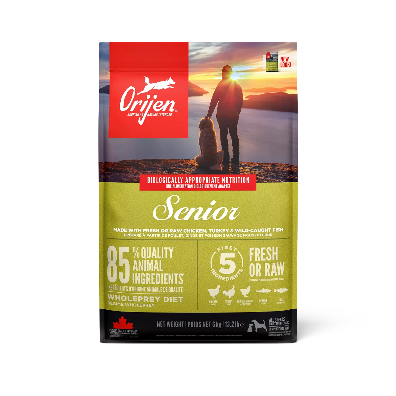 Los perros senior tienen necesidades nutricionales específicas. Una dieta rica en proteínas procedentes de ingredientes animales enteros les proporciona todos los nutrientes que necesita para gozar d,»e una salud óptima, manteniendo una buena masa muscular y un peso óptimo. 2/3 de nuestros ingredientes animales son frescos o crudos y 1/3 están deshidratados para proporcionar una fuente concentra»,a de proteínas. Con carne, órganos, cartílagos y huesos de pollo y pavo frescos criados en libertad, pescado salvaje y huevos frescos de corral, Orijen Senior ofrece a estos perros mayores todos los,»utrientes y vitaminas que necesitan en esta etapa de la vida. «,»Pollo fresco (18%), pavo crudo (10%), menudillos de pollo frescos (hígado, corazón) (10%), arenque entero crudo (6%), merluza entera y cruda (5%), huevos frescos (5%), hígado de pavo crudo (5%), pol»,»lo deshidratado (5%), pavo deshidratado (5%), caballa deshidratada (4%), sardina deshidratada (4%), arenque deshidratado (4%), lentejas rojas enteras, lentejas verdes enteras, guisantes enteros, fib»,»a de lenteja, garbanzos enteros, alubias pintas enteras, almidón de guisantes, aceite de abadejo (2%), grasa de pollo (2%), alubias blancas enteras, algas marinas secas, calabaza fresca entera, cala»,»hojas de remolacha frescas, hojas de nabo frescas, arándanos rojos enteros, arándanos azules enteros, bayas de Saskatoon enteras, cúrcuma, cardo lechoso, raíz de bardana, lavanda, raíz de malvavisc»,», escaramujos.ADITIVOS (por kg) Aditivos tecnológicos: extracto de tocoferol de aceites vegetales: 121mg, ácido cítrico: 40mg. Aditivos organolépticos: extracto de romero: 80mg. Aditivos nutriciona»,»es: 3b606 (Zinc: 105mg), 3b406 (Cobre: 5,5mg), 3a821 Vitamina B1: 9,8mg, 3a841 Vitamina B5: 12,5 mg, 3a700 Vitamina E: 120UI. Aditivos zootécnicos: 4b1707 Enterococcus faecium NCIMB 10415 2,2×10^6 U»,C.,»Proteína 38% Contenido de grasa 15%Materia inorgánica 8% Fibra bruta 6% Humedad 12% Calcio 1,3%Fósforo 1,1%Omega-6 2,3%Omega-3 0,9%DHA 0,3%EPA 0,2% «,3710 kcal/kg (445 kcal por vaso 250ml/120g).,